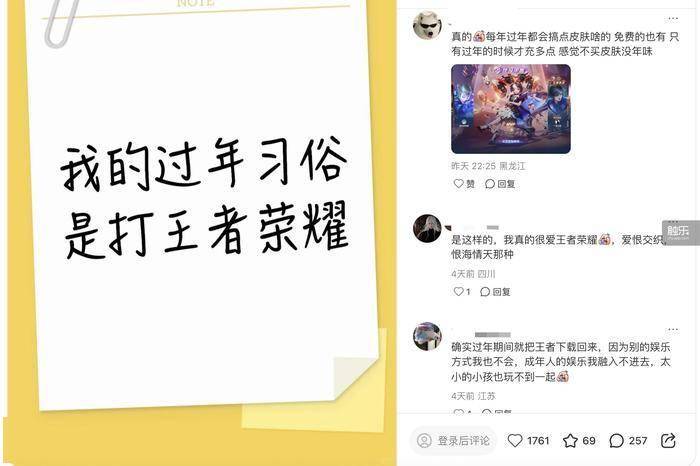 这条帖子总共得到了接近2000条点赞评论,不少玩家回复“我也是!到过年假期就下回来玩”、“确实过年期间就把王者下载回来,因为别的娱乐方式我也不会,长辈的娱乐我融入不进去,太小的小孩也玩不到一起”、“过年期间的王者是最好玩的”。