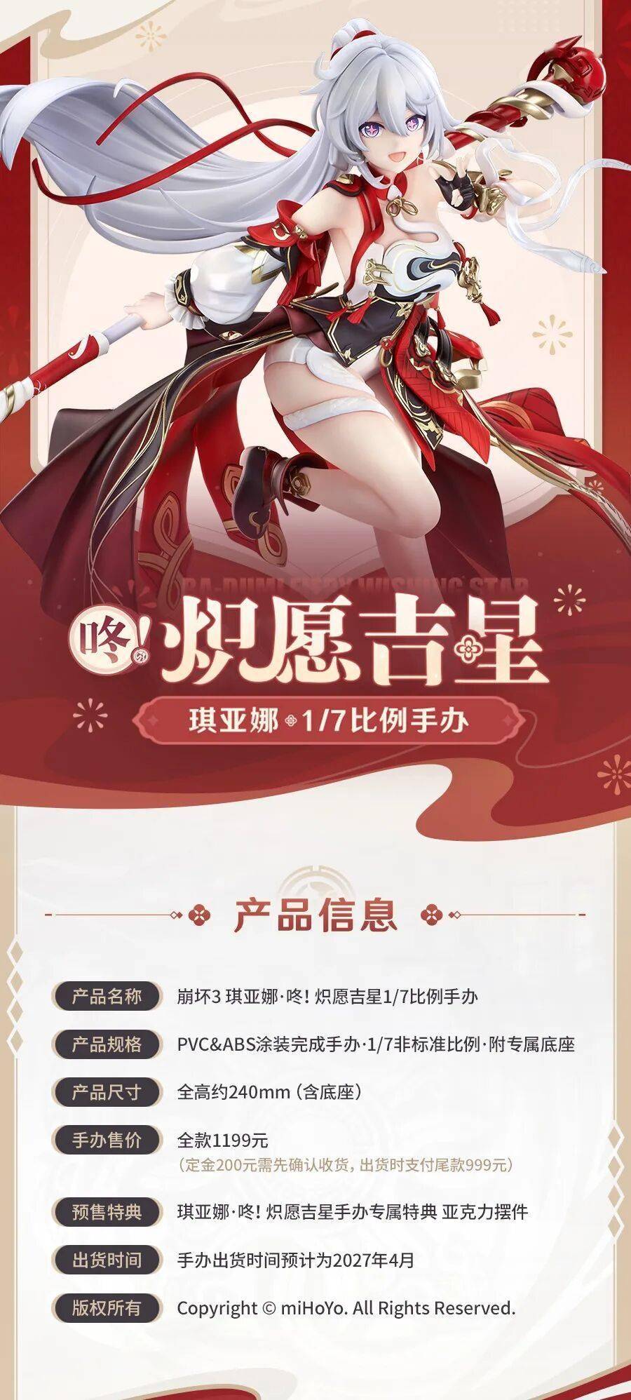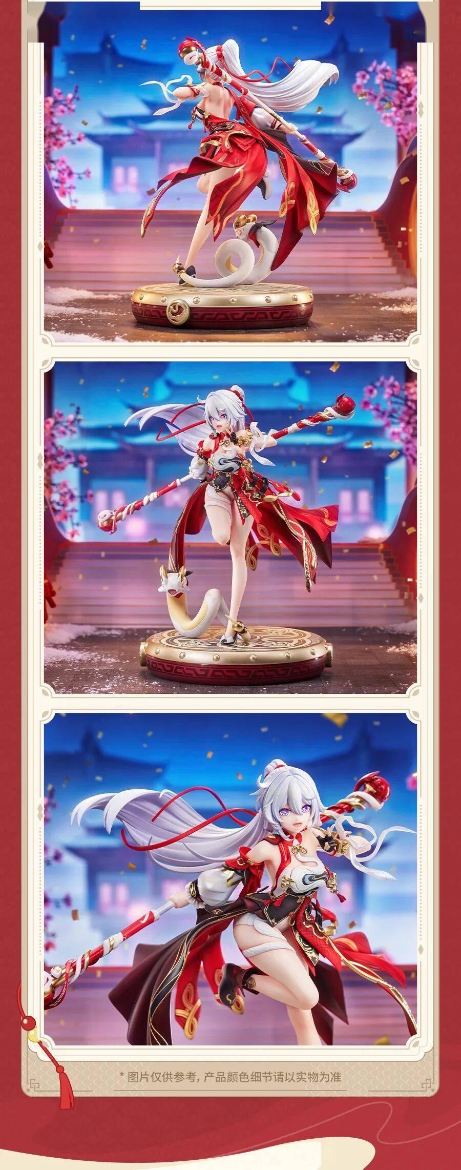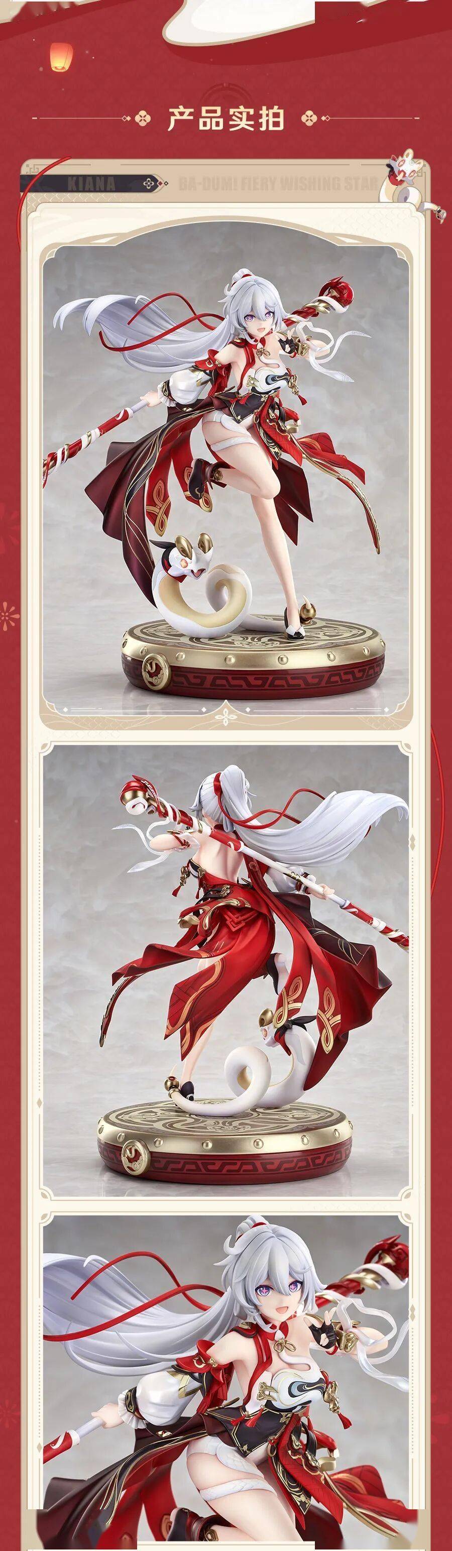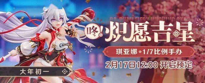舰长新年好,「琪亚娜・咚!炽愿吉星1/7 比例手办」携福登场,新春添喜,福气满满!角色长发与飘带随风扬起,整体造型张力十足。配色融合中式纹样与装甲元素,采用多重涂装工艺打造,红衣以特殊上色还原细腻光泽,金纹与褶皱均精心雕琢。搭配专属鼓面底座与萌趣吉祥物“年糕”,预定即赠亚克力特典哦!