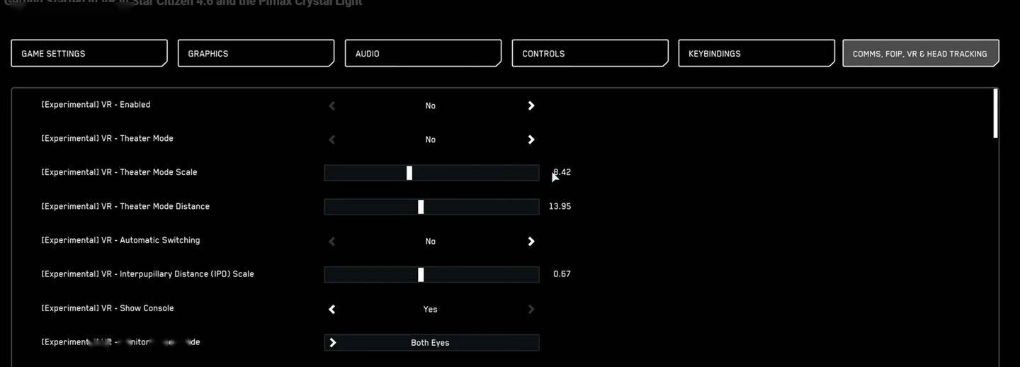而如今《星际公民》Alpha 4.6 版本终于在设置菜单中加入了 VR 选项,允许玩家直接在菜单中直接启用或管理 VR 模式,操作流程有所简化。不过玩家仍需在配置文件和游戏设置中对 OpenXR 参数、分辨率缩放(Upscaling)、UI 缩放比例、显示距离、IPD(瞳距)校准等参数进行特别细致调节才能获得较佳沉浸感。