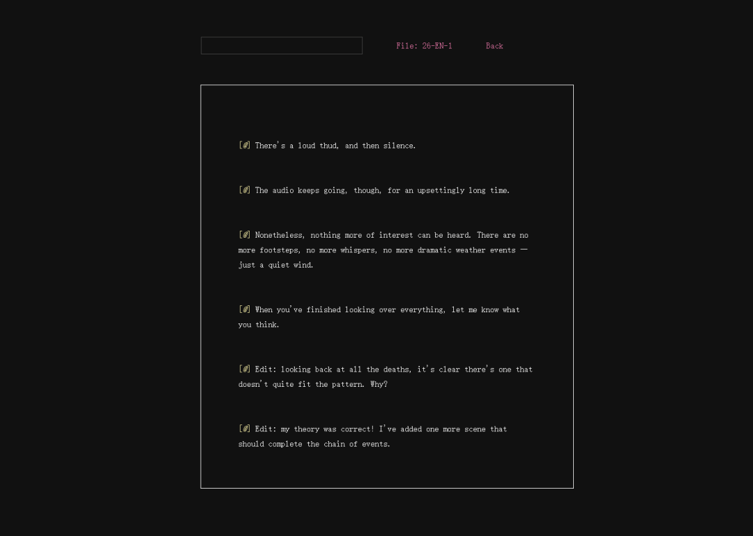 游戏从几份档案文件开始,每份文件都记录了某时段内若干角色在特定场景的对话,玩家需要通过上下文推理出哪些角色会在何时出现在何地,按照固定格式在数据库中检索,以解锁新文件,一层层抽丝剥茧,最终抵达真相。游戏整体游玩体验有点像文字版的《疑案追声》——制作人 William Rous 也明确表示《疑案追声》是本作的灵感来源之一。不过小小剧透一下:对于本格推理爱好者来说,游戏的核心诡计可能会让你失望。本作的付费重制版《The Incident at Galley House》目前正在开发中,最终成品效果值得期待。