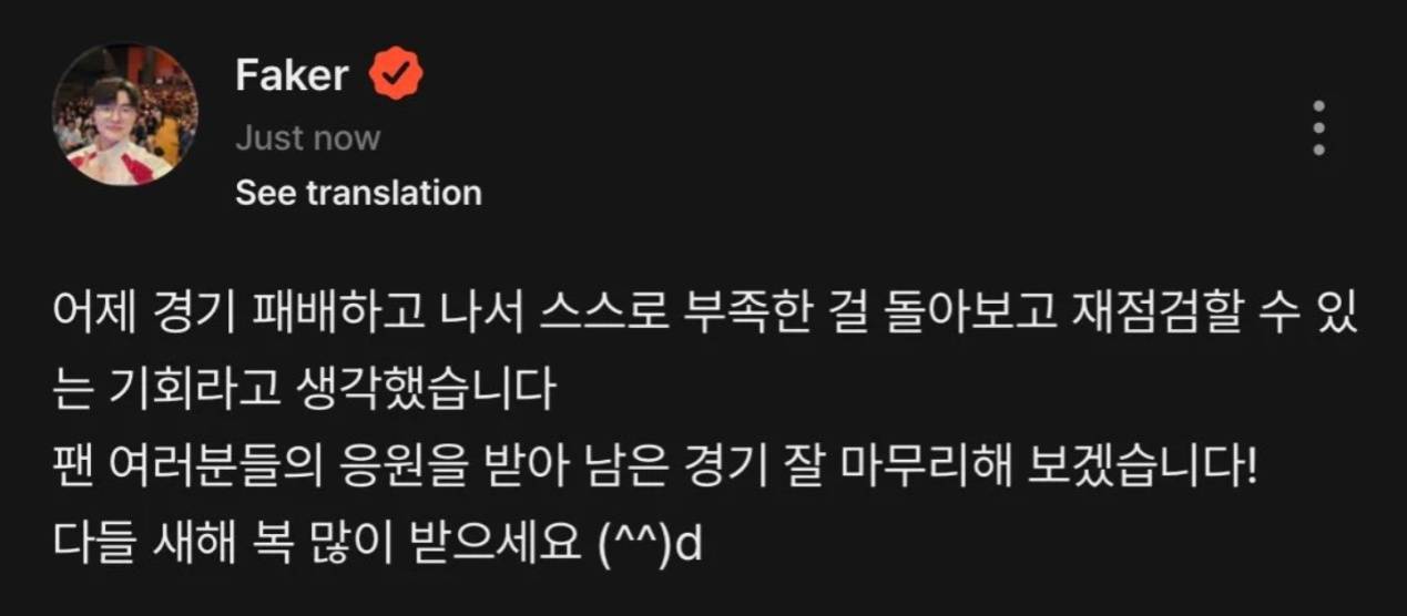 Faker也在最新的动态中表示会把这一次的失败当作一个反省自身不足和重新审视自己的机会,就是要总结这一次失败的教训,然后尽全力赢下剩余的比赛。