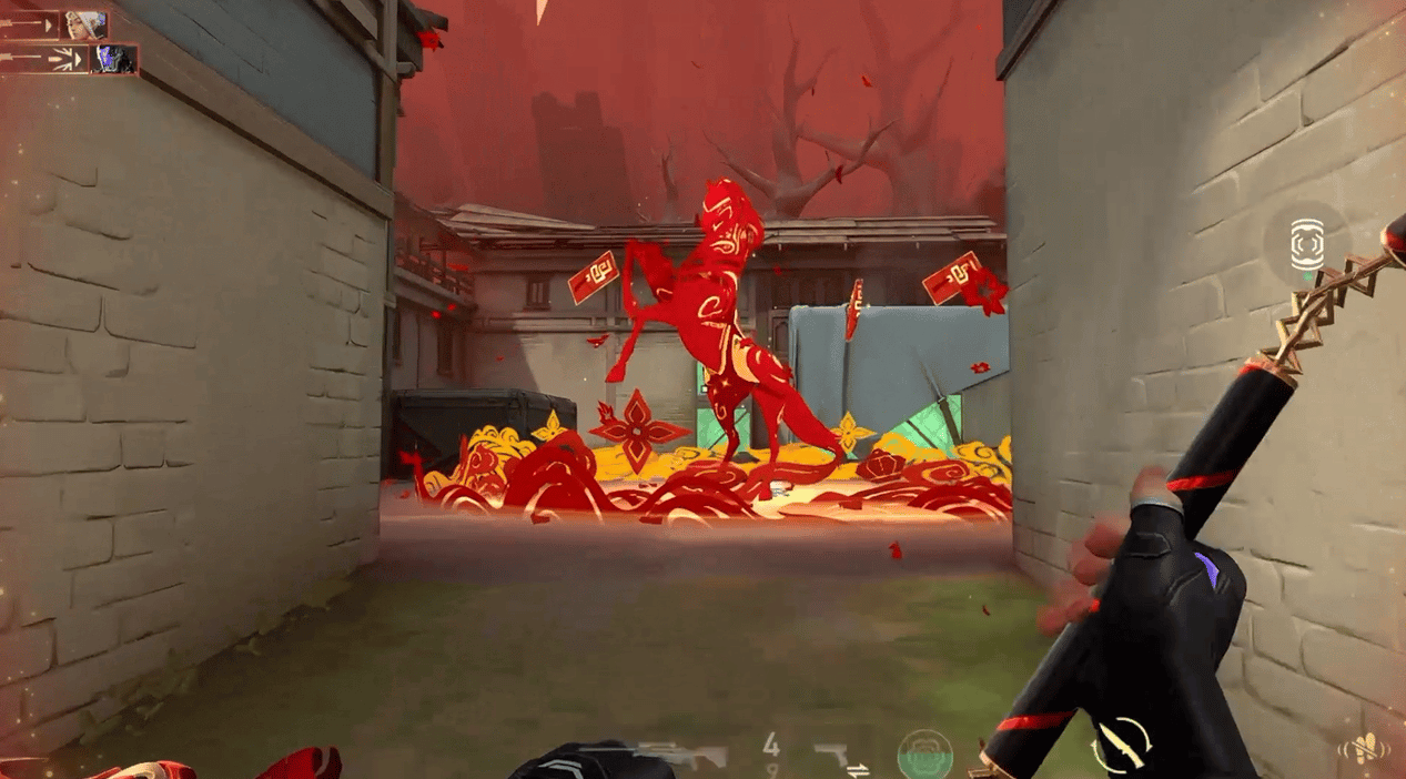 击杀特效是另一重惊喜。放倒对手后,一匹红金配色的骏马急停昂首,跃然而出,周围还飘着剪纸、红包这些祥瑞元素,竞技的热血感和春节的喜庆感撞在一起,视觉冲击极强。