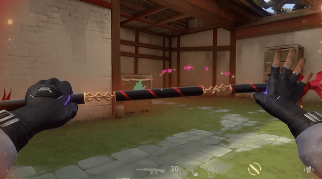 近战武器的设计同样别出心裁。刀身采用中国传统武术软兵器三节棍的形态,结合枪尖造型,构成了瓦手全新的近战模组。无论是检视时的甩动、切枪动作还是挥砍轨迹,都流畅丝滑,既保留了传统兵器的韵味,又完美适配手游端的操作手感。