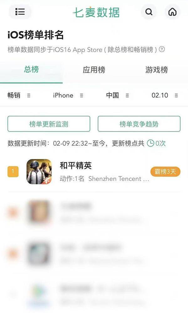 自2月7日起,《和平精英》连续3天霸榜总榜畅销榜第一