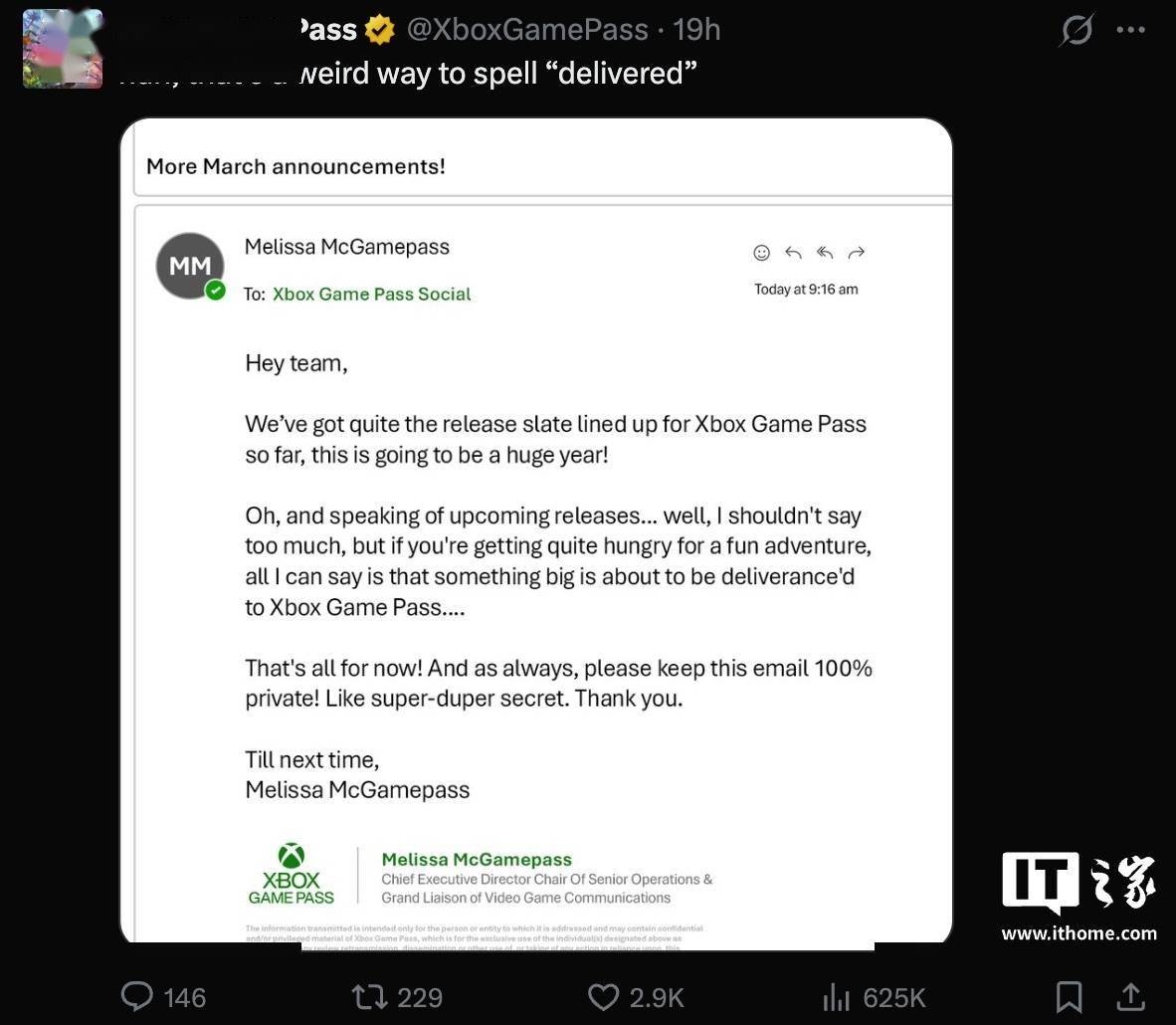 不过,微软在原文中将“delivered”单词写成了“deliverance”,官方也在配文中提醒读者“这个单词的拼写方式真奇怪”。对此,外界推测这大概率是在暗示《天国:拯救 2(Kingdom Come: Deliverance 2)》即将加入 Xbox Game Pass 游戏阵容。
