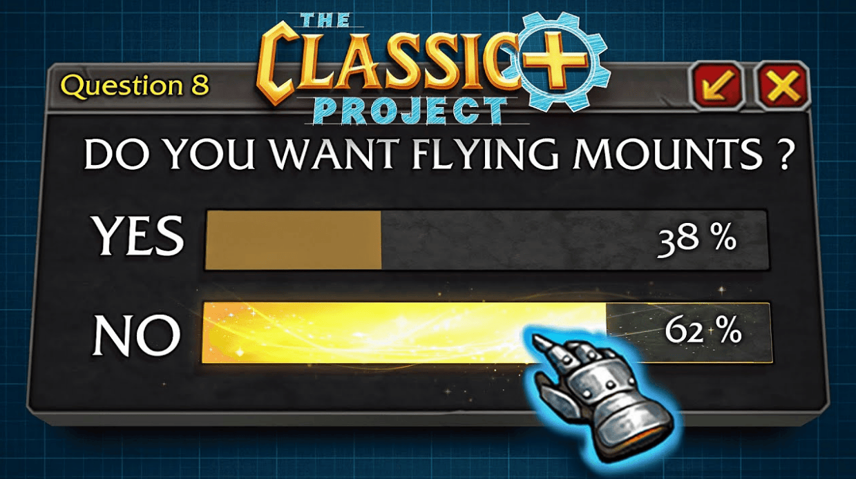 飞行坐骑是TBC加入,在“经典+企划”的调查中,近81%的玩家认为飞行坐骑不应该出现在Plus2.0。