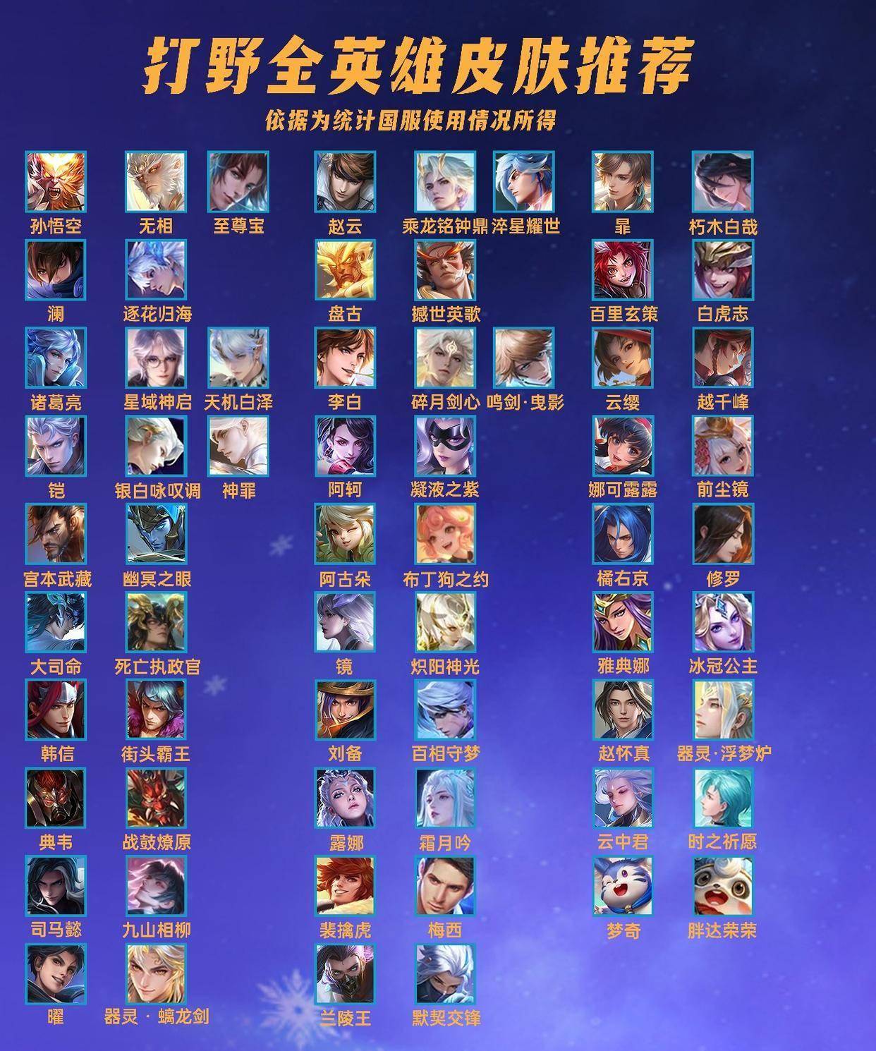 这一篇文章我们来汇总一下打野位的英雄推荐使用什么皮肤,因为之前已经把几乎所有英雄的国服皮肤使用情况都统计完了,只有一些仅有一款皮肤或者是没有皮肤的不需要统计。现在做一个汇总系列,把全英雄都汇总出来,分位置发出来。
