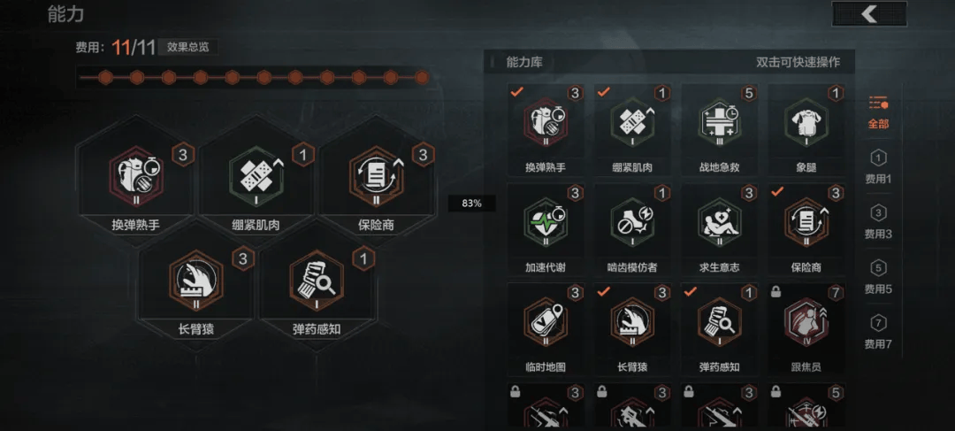 此外,战术能力也是暗区的一大特色,它对玩家生态位的影响更深入。举个例子,「弹药估算」是一个很容易被忽略的能力,对高端玩家来说,时刻掌握弹夹里有几颗子弹,既会影响那一刻的临时决策,也决定了对枪时的优劣势,甚至是一瞬间的胜负。