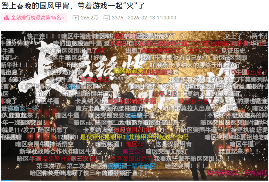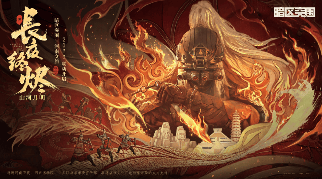 紧接着14号晚上,《暗区突围》与河南春晚的共创节目《长夜终烬》登台演出,节目以游戏最新国风甲胄「长夜将军」为核心视觉载体,把硬核军武美学和现代数字艺术融合在一起,给观众带来一场新鲜的视觉盛宴。