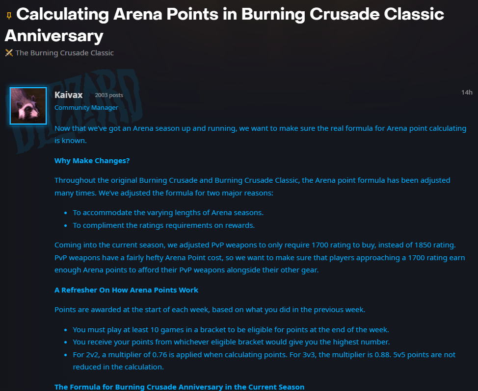 《魔兽世界》周年服TBC竞技场S1赛季于2月19日开放,暴雪同期更新蓝贴,公布周年服竞技场的最新改动及点数计算公式。