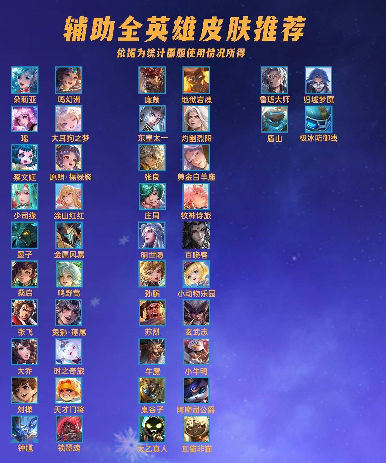 这一篇文章我们来汇总一下辅助的英雄推荐使用什么皮肤,因为之前已经把几乎所有英雄的国服皮肤使用情况都统计完了,只有一些仅有一款皮肤或者是没有皮肤的不需要统计。现在做一个汇总系列,把全英雄都汇总出来,分位置发出来。