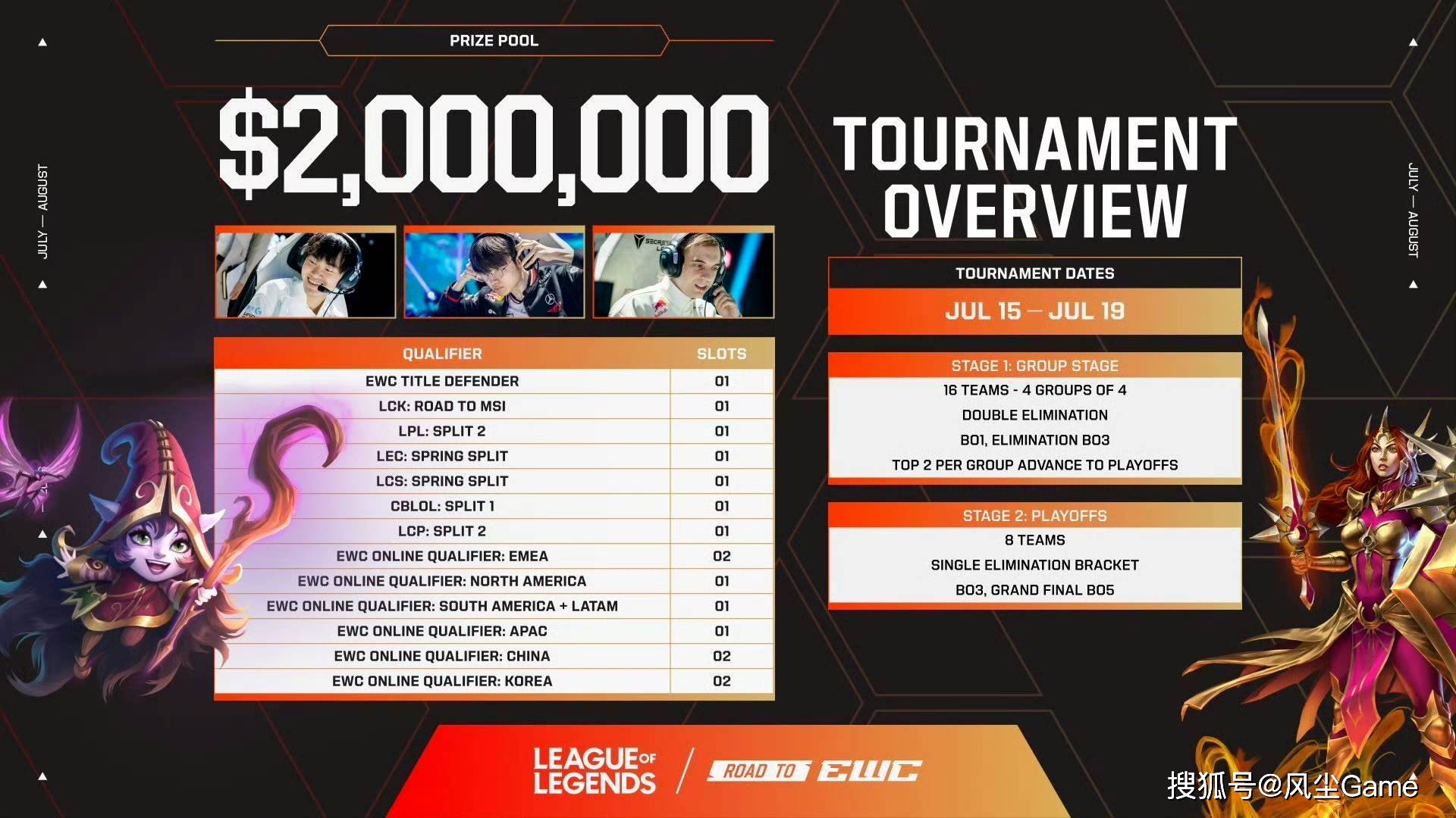 除了直邀队伍之外,LPL和LCK赛区,还有2个参赛名额,LCK的话是3个,LCP、CBLOL、LCS各一个,正赛开打之前,要先打预选赛,LPL、LEC、LCK各两队,剩下三个赛区各一队,预选赛总计9支队伍参赛,赛制方面,小组赛16队分4组打双败,前2名晋级,淘汰赛BO3,决赛BO5。