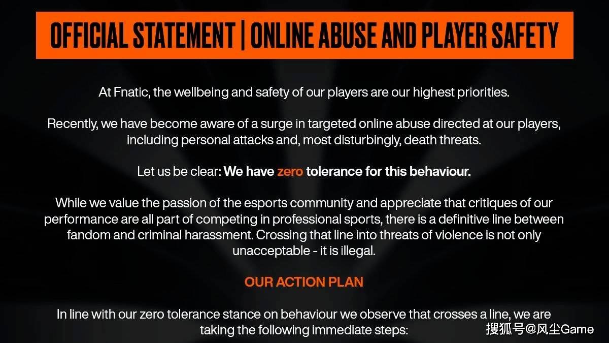 FNC部分极端粉丝,在论坛里疯狂攻击选手和教练,甚至还有人发布死亡威胁言论,FNC俱乐部得知之后,发布声明:我们对网络暴力和死亡威胁0容忍,俱乐部已经取证,把相关证据提交执法机关,好家伙,欧洲观众是真的疯狂啊,看个比赛,都能搞出死亡威胁这套,这真有点吓人吧。