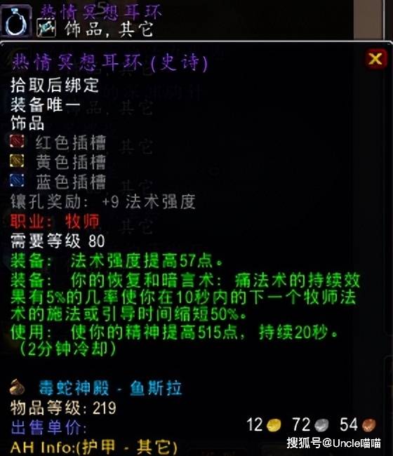 眼前的时光服还是真的可以玩的,喵叔个人觉得现在时光服魔改的核心,就是让玩家打的舒心,团本整体难度下滑,装备数值全面拔高,以至于就算是风暴要塞和毒蛇神殿双本连打,也不会超越玩家心理预期。对于牧师而言,职业专属的饰品热情冥想耳环,可以说是在预期内的质变饰品,当然局限于治疗牧师,暗牧的话只能说是一般般,鱼斯拉掉落的耳环,现在均价基本上1000金币左右能够拿下,毕竟治疗牧师都是专业吃排骨的谦让玩家,你一个我一个,大家谁也不挨饿!不过这里喵叔要对暗牧说句掏心窝子的话,如果你专注暗牧又不玩治疗的话,千万别入坑热情冥想耳环,真的不合适,我的大兄弟!