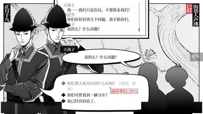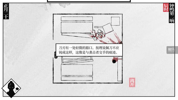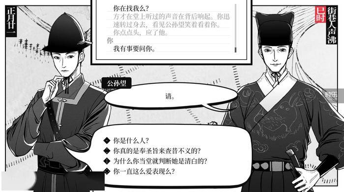 游戏开始还不到半个小时,从序章的小案子跳入第一章的大案,在制造令人惊骇的转折之余,竟然也让玩家在情绪上数次急转,不仅对案件本身、也对人物命运迅速产生共情,让人欲罢不能。简练、准确的文字叙述,配合总体白描的画面,虽然本质上是单人开发在成本上的控制,却达成了一种留白且意犹未尽的效果,意外地和游戏的“江湖气质”非常契合。