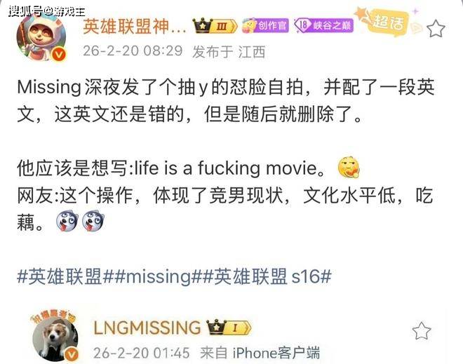 辅助选手missing在20号凌晨的时候发布了两张自己抽Y的动态图,并且还配上了一则英文,lifeitsfkingmove,说实话,怎么看怎么不对劲?有细心的网友发现他想表达的意思应该是,life is a funky movie,翻译过来就是人生如戏,演好自己。不知道是不是自己发现发错了,他也是随后快速删除了这条消息,但还是有眼尖的网友截屏发了出来。说实话,他这句话应该体现了现代电竞男选手的现状,整体的文化水平太低了,很多人都是初中时候就辍学,成为网瘾少年的。