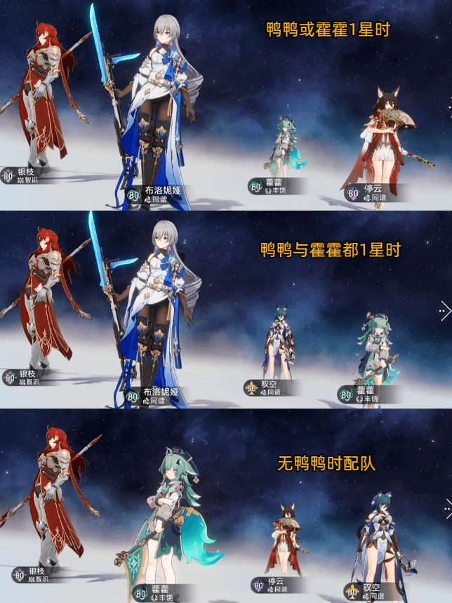 说明:一般情况下,布洛妮娅与银枝很搭,要想起到最强战力,鸭鸭是必须的,另外2个队友常规是霍霍与停云,来保证充能。