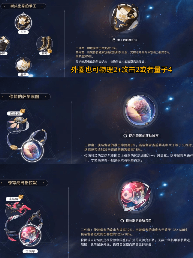 遗器:外圈推荐物理4件套,也可物理2+攻击2或者量子4,就比物理4差5%左右;内圈推荐萨尔索图或者格拉默,格拉默需要速度堆得够高。