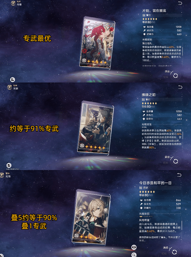 说明:专武是最佳的,其次则是景元专武与4星“今日亦是和平的一日”,其他像姬子专武叠1时只有83%左右银枝专武战力,除非叠的高不然不推荐。