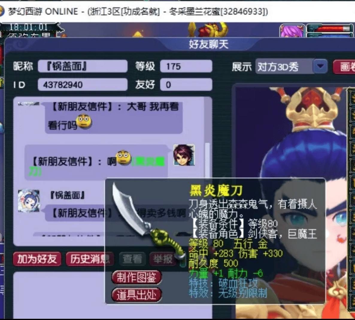 【功成名就】一位酷爱刷场景的少侠近日运气爆棚,成功炸出一把80级无级别破血大刀。初总伤高达424,虽附加属性一般,但基础属性颇为亮眼。对69玩家而言,高伤、低耐久成本的武器本就是任务首选,再搭配物理系PK必带的破血特技,带在街上绝对是最靓的仔。