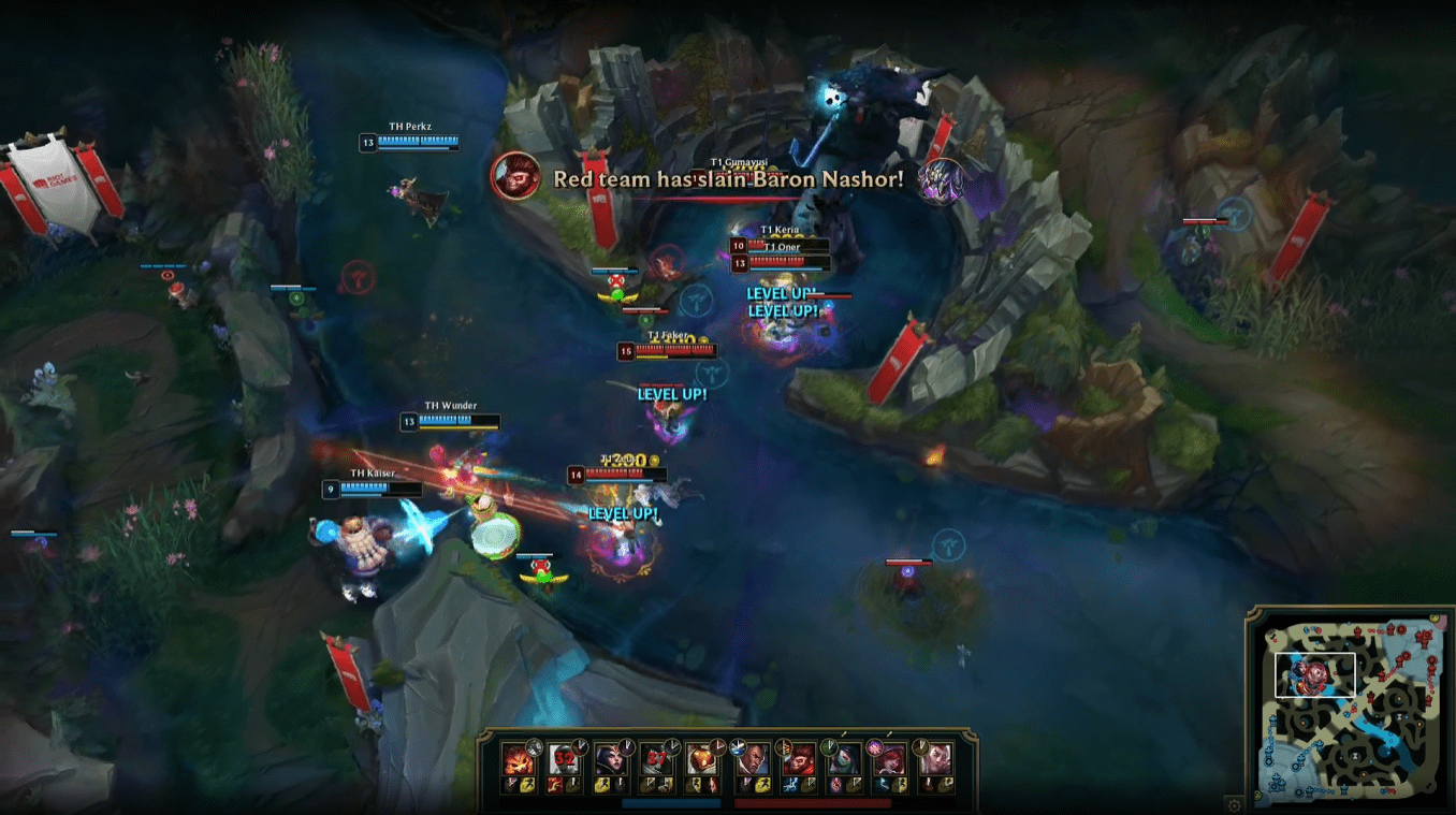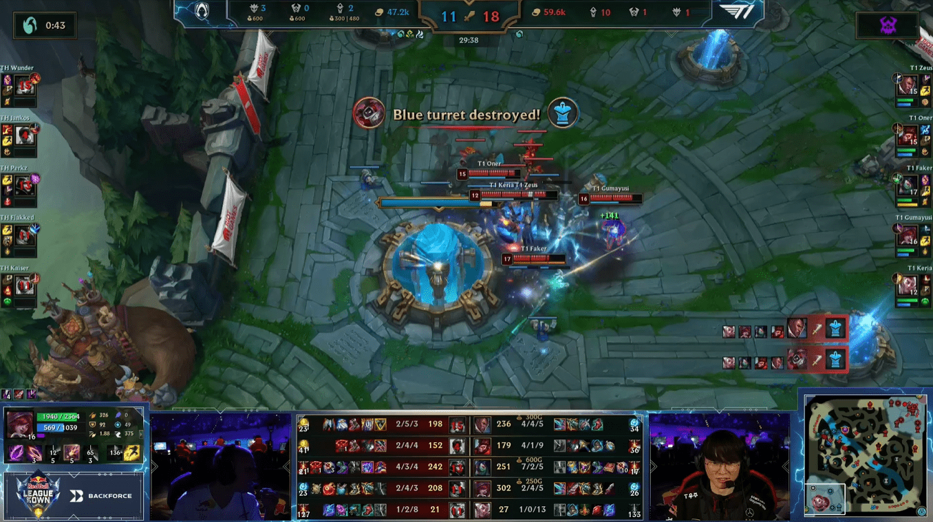 打强队下重手,T1在23分钟就拿到了大龙,并且推上了TH的高地。这也是前几局没看到过的碾压速度,虽然TH控了不少小龙,但T1的中期经济优势太大了。