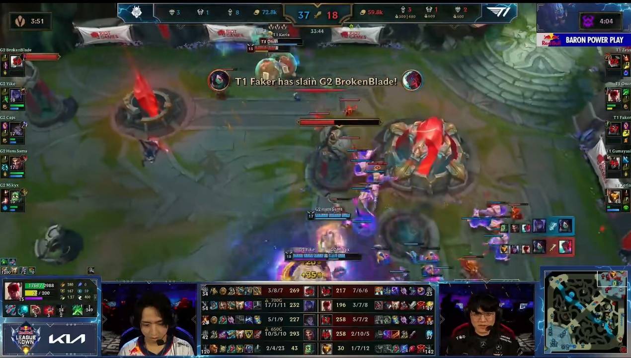 在这个过程中,Zeus分别拿出了阿克尚和薇恩上单,薇恩完成两次单杀,阿克尚方面对线完成压制但被波比单杀,Gumayusi更是拿出了大虫子,Oner方面则隐隐有回归联赛表现得趋势,比赛中多次出现搞笑失误。