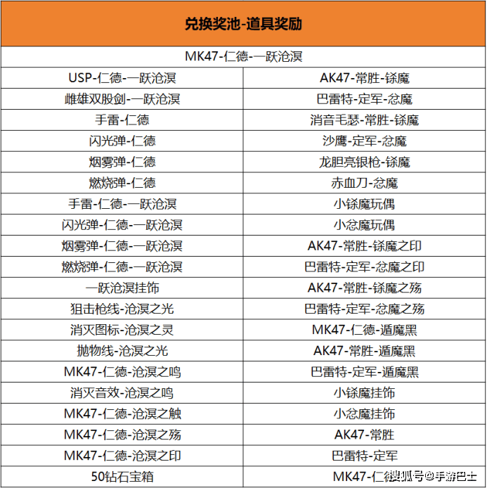 刚才还提到了每10抽会触发的2个特殊奖池,特殊奖池A主要为各武器的各类万化,当然也有钻石和赏金令积分宝箱;而特殊奖池B为沧溟兑换币,至多可达88沧溟兑换币。实际抽奖的时候大家可以按照价值和需求来从2个特殊奖池中选1份奖励。下图是两个特殊奖池的道具一览表,CFer可点击下图详细查阅: