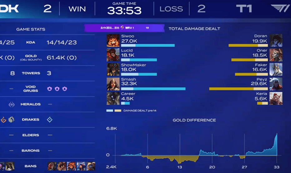 其实第四把一开始的时候,Oner亚恒就带飞了,中路直接打烂了DK,立马许秀蛇女又被抓,还以为DK要没有了,当时DK选手都捂脸了,玩不下去了,猴子两个残血,一个没杀,自己还被反杀了,心态炸了。