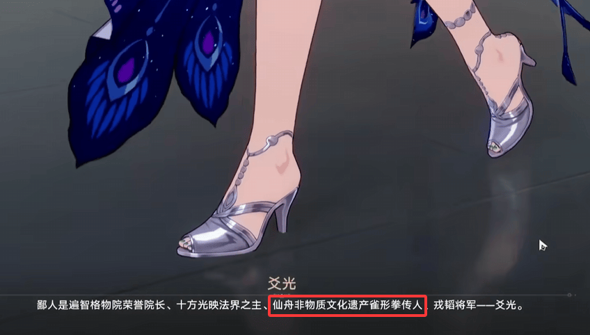 在登报之前,大家讨论最多的,是爻光身上极具辨识度的孔雀元素。这不仅是因为爻光的肢体动作、体态设计、服装细节都拥有满满的孔雀元素,而且在主线中,爻光还自称是仙舟非物质文化遗产“雀形拳传人”,这层buff,也让爻光的文化底蕴更上一层楼。