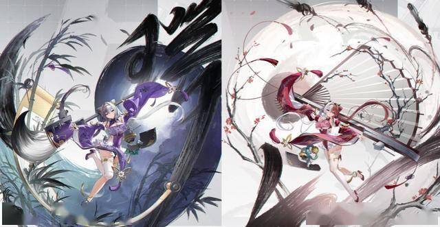原本肇和与应瑞作为一对姊妹,在形象上就很是惊艳。她俩的设计巧妙地与“书画”概念相结合,把现代化舰装巧妙融入毛笔、画轴、扇轴等传统文化物件,尤其是鱼雷的尾迹改用水墨代替,相当具有意境。这既彰显出敦煌文化的深厚底蕴,又凸显出姐妹俩“能文能武”的独特气质。在全新的改造立绘中,这些设计得到了继承和进一步发扬。