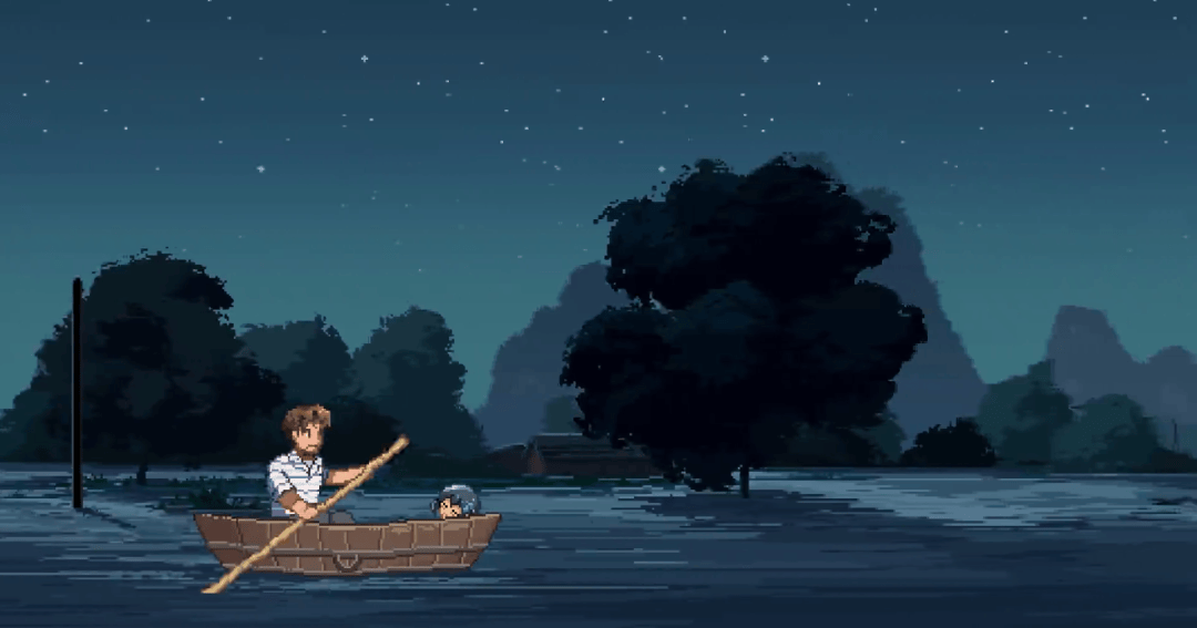 天上是漫天星斗,水面上,一名父亲带着女儿在黑夜中踽踽前行。