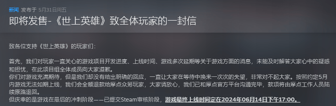 2024年1月,经过近2年的等待,游戏终于宣布将在今年5月正式上线。而到了5月,游戏又双叒叕宣布延期至6月14日。