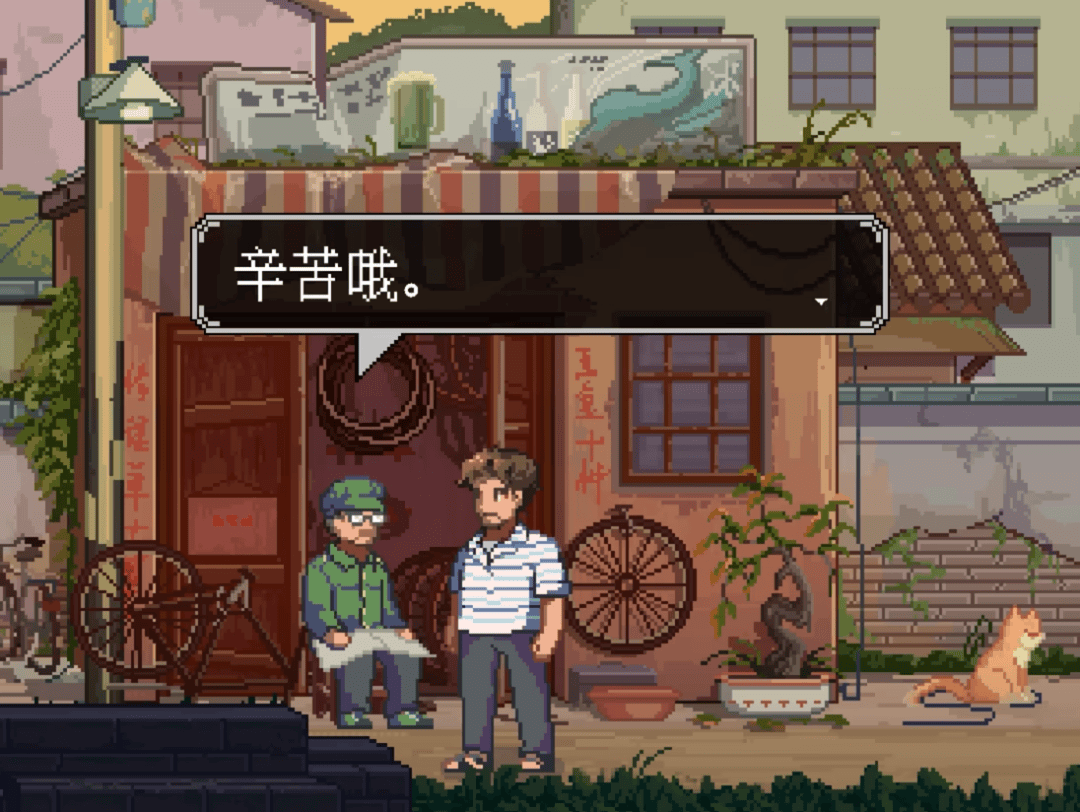 例如,在塑造补胎店里的「梁叔」这一形象时,在店铺大背景上,游戏用红砖墙、铁皮顶,以及几块砖头压在屋顶防雨的三色布,建造了一个破栏棚屋的环境;同时,游戏用眼镜、报纸,从外貌角度建构出了一个能识字、有手艺的中老年人形象,并通过和自家老头捉鸡、念报纸新闻等对话加深了这一印象。