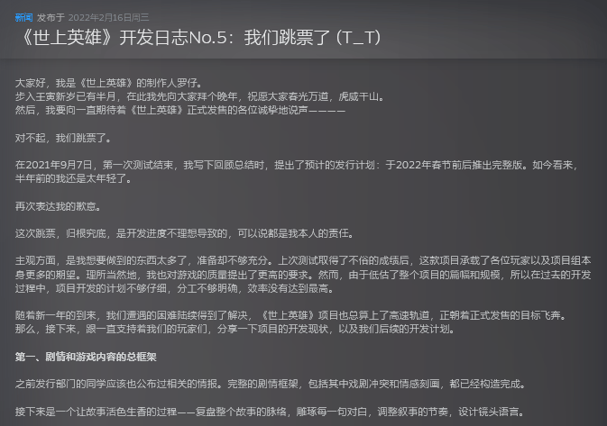 然而,在2022年春节过后不久,曾罗克代表制作团队,发布了游戏延期的公告。同样的一幕在接下来的2年里还将多次上演。