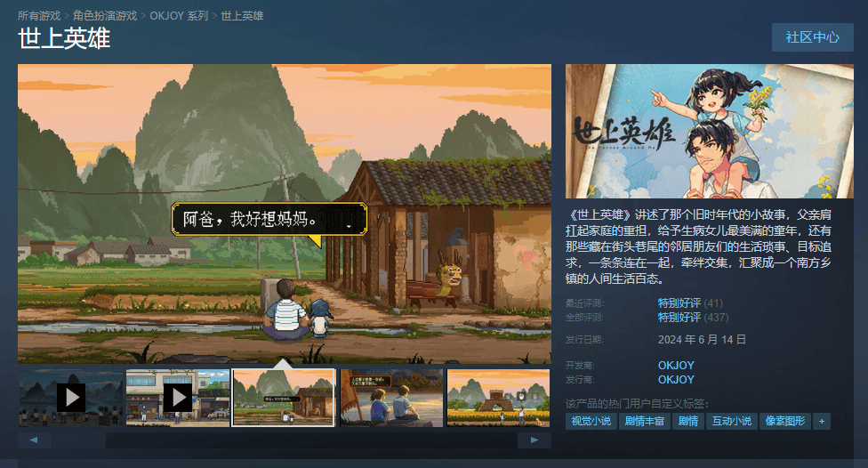 2021年8月31日,一款名为《世上英雄》的游戏在TapTap进行了首次测试。在20多分钟的Demo里,玩家将扮演一名父亲,在90年代的南方乡镇,与女儿共度亲子时光。开测后,该作品在TapTap、好游快爆上的评分都是9.8,位列新品榜前十。
