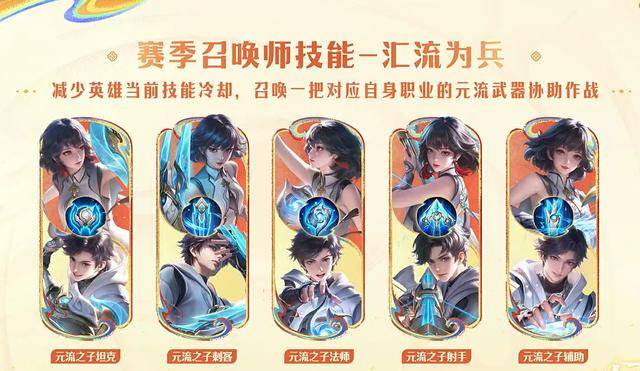 赛季召唤师技能(汇流为兵)是根据携带者的职业获得对应元流之子的相关技能效果,比如辅助带上赛季召唤师技能(汇流为兵),则召唤师技能则是元辅的大招,释放会减少其他技能的CD。