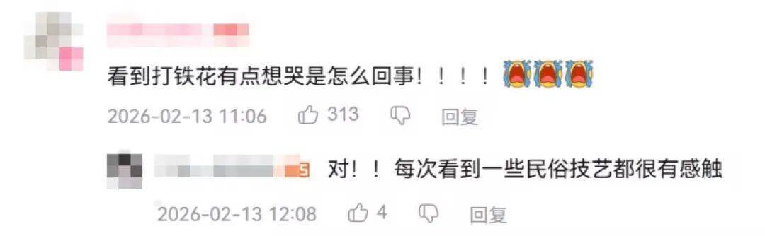 从新华社发出的纪录片来看,老师傅们口中打铁花的精神就在于“即便只有一瞬,也要璀璨绽放”,“即便眼前全是黑暗,也相信前方有光,要闯出去”。正如春晚节目的“长夜终烬,山河月明”,它和身穿甲胄的将士都是在为同一种追求而拼尽全力。