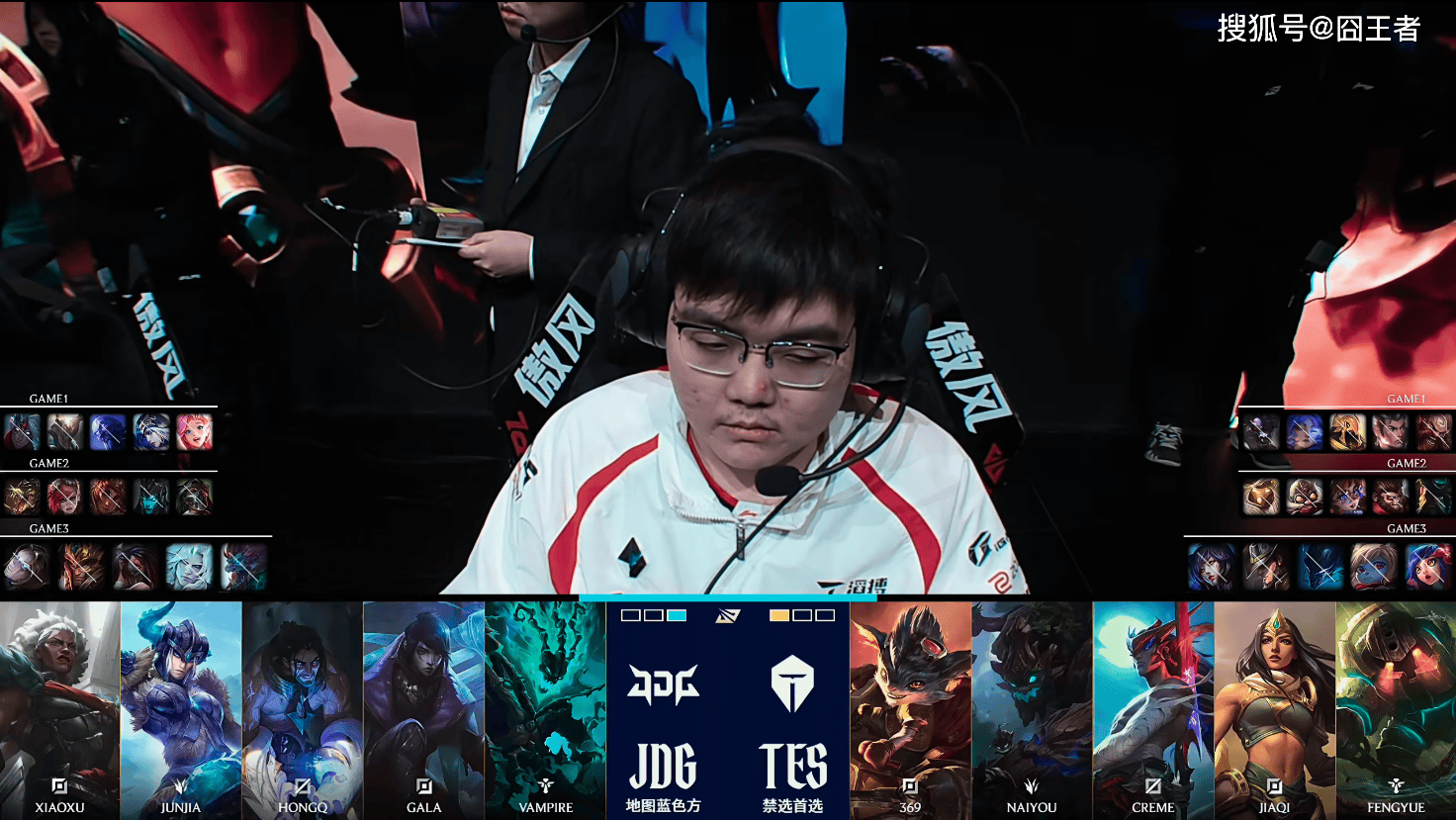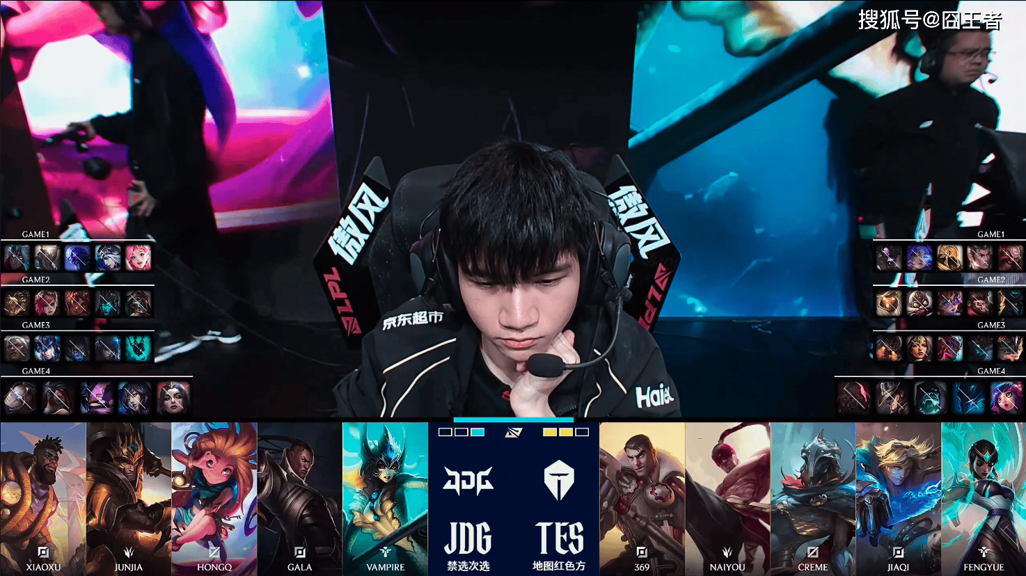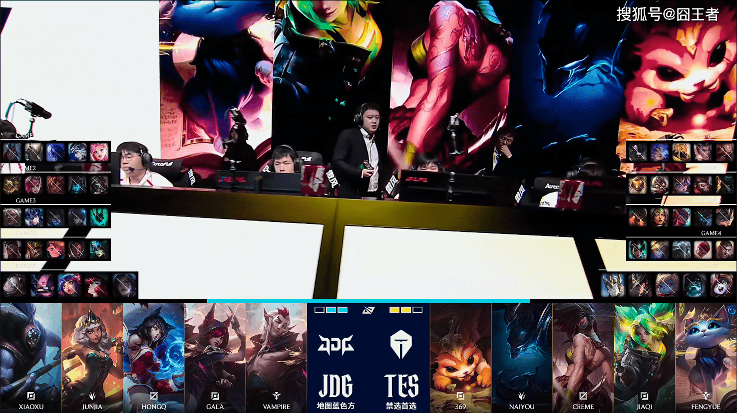 决胜局,J DG蓝色方,禁用:发条、凯南、妮蔻、女枪、卡莎,选用:Xiaoxu贾克斯、Junjia奇亚娜、HongQ阿狸、GALA霞、Vampire洛;T ES红色方,禁用:加里奥、卡牌、波比、掘墓、璐璐,选用:369纳尔、Naiyou梦魇、Creme阿卡丽、JiaQi泽丽、Fengyue悠米