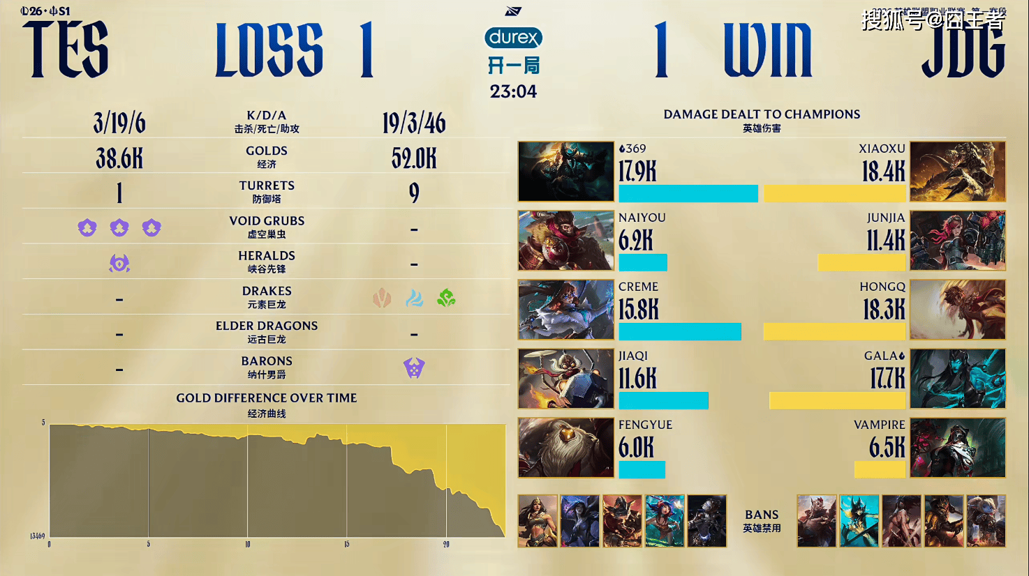 结果第二局比赛,JDG打出了完全的碾压局。比赛前15分钟,两队打得比较平稳,经济差距不大,比赛第17分钟左右,Xiaoxu鳄鱼爆砍三杀,JDG小龙团0换4大胜;比赛第19分钟左右,TES上路团再度溃败,JDG强势打出0换4拿下大龙;比赛第 21分钟左右,JDG带大龙Buff从下路推进打出0换2;最终比赛第 23分04秒,JDG一波打出0换4后结束比赛。