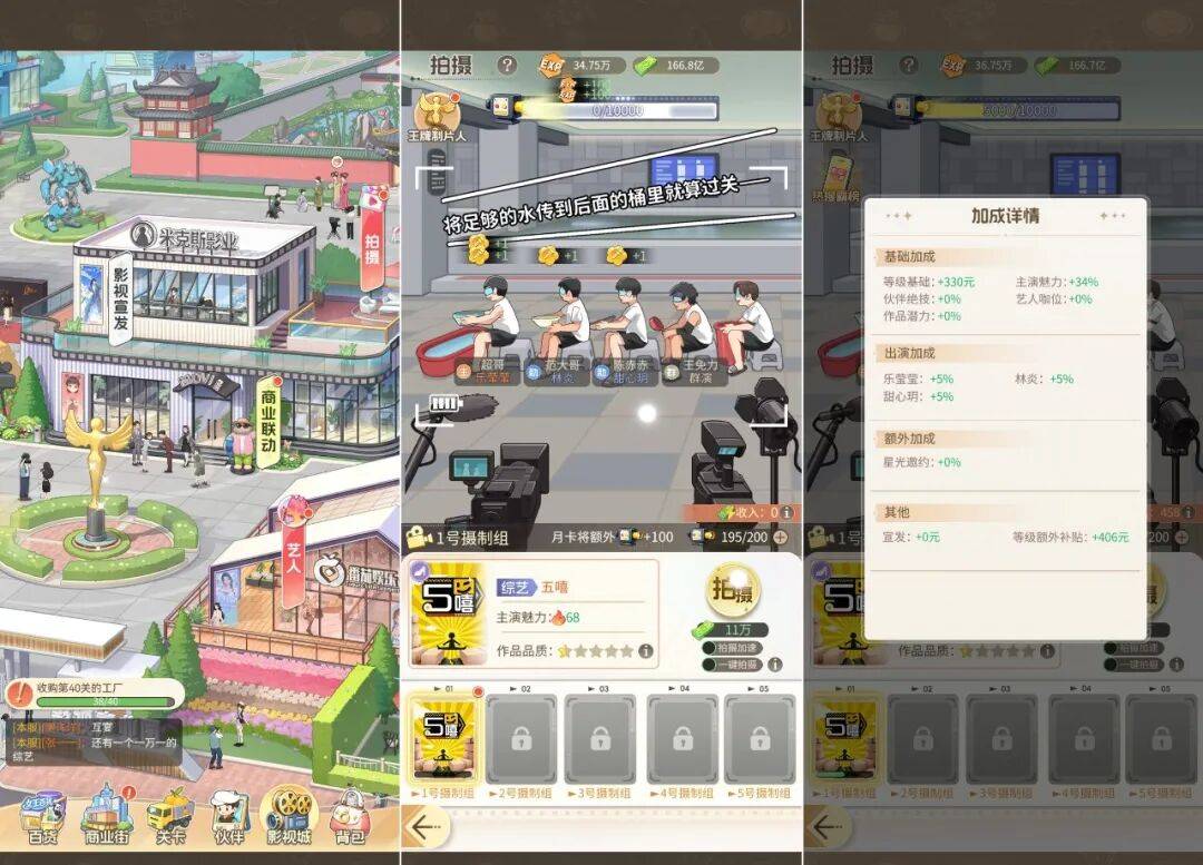 解锁影视城模块后,玩家可以通过投入资金、消耗拍摄次数来制作各类影视作品。作品最终收益由演员魅力、玩家等级、题材类型与市场反响等多重因素共同决定。已完成的影视作品还能与其他玩家的作品展开商业联动,进一步获取额外收益。