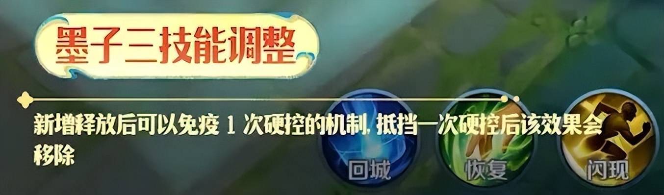 墨子是针对目前的痛点进行了优化,对三技能新增了一次可以免疫硬控的机制。目前墨子的大招不是霸体,很容易在展开的瞬间被敌方打断。但现在第一次可以免疫硬控,至少可以保证在实战中有展开的机会,且可以持续更久的时间。但是,这并不是霸体,而是在第二次硬控的时候依旧会被打断施法。