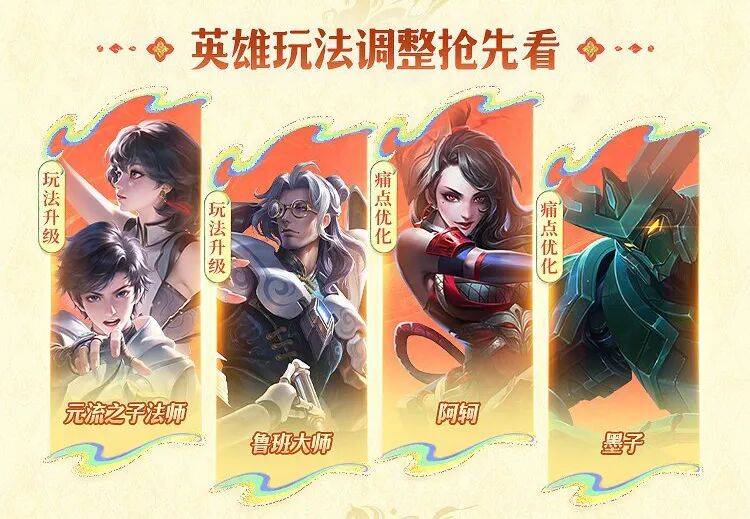 另外,多个英雄即将迎来玩法调整,包括元流之子法师、鲁班大师、阿轲、墨子这四位英雄。