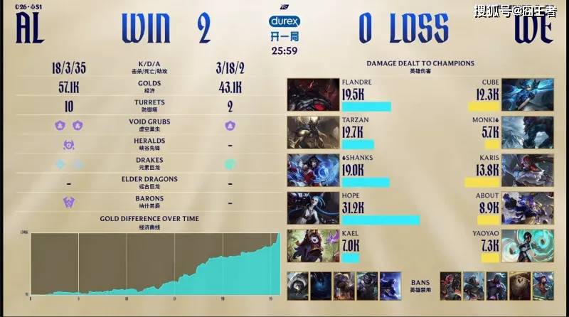 结果第二局比赛,依旧是AL打出了碾压局。3分钟,Flandre塞恩流畅换血,卡不灭之握闪现平A单杀Cube格温;8分钟,Cube格温持续迷失,八分钟已经被击杀三次;13分钟,Flandre塞恩果断传送绕后支援,AL持续追击完成1换3;17分钟,Flandre塞恩顶住成吨伤害,Hope伤害拉满AL团战轻松取胜;最终25分59秒,AL再次团灭WE,再赢一局,手握三个赛点。