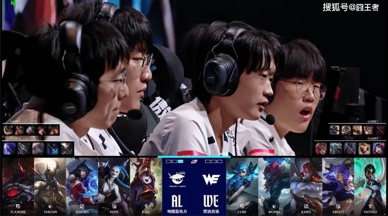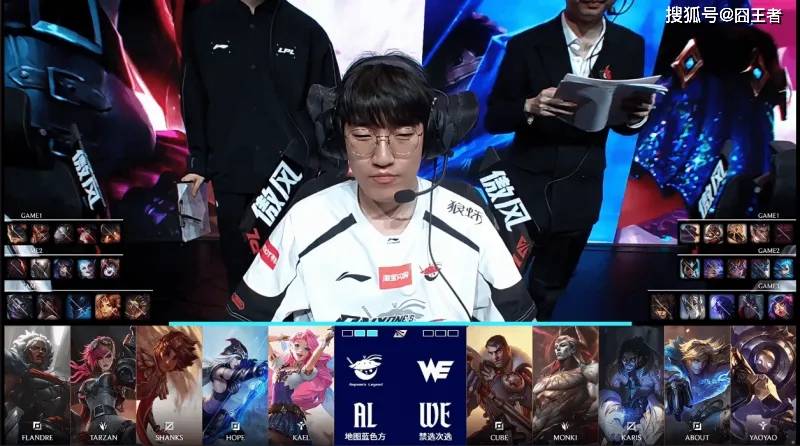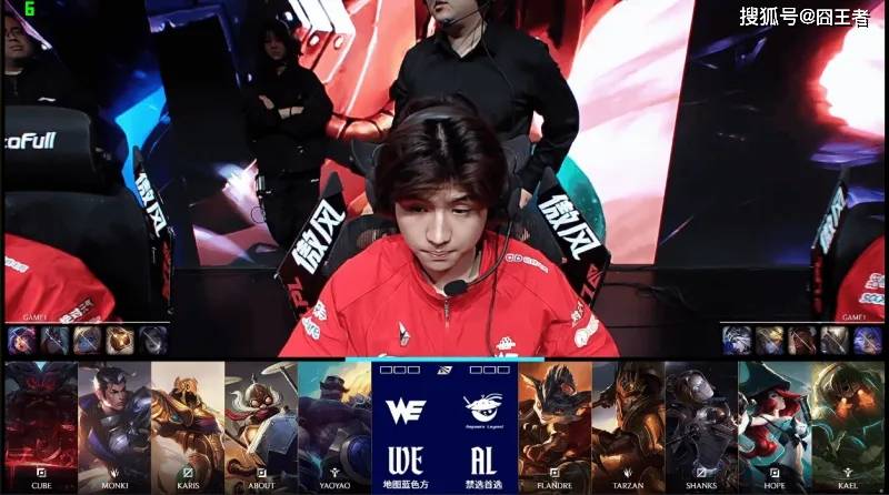 第一局比赛,WE蓝色方,禁用:妮蔻;韦鲁斯;波比;巴德;卡莎,选用:Cube奥恩;Monki赵信;Karis沙皇;About飞机;yaoyao布隆;AL红色方,禁用:芸阿娜;潘森;奎桑提;伊泽瑞尔;寒冰,选用:Flandre兰博;Tarzan皇子;Shanks发条;Hope女枪;Kael泰坦