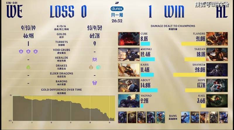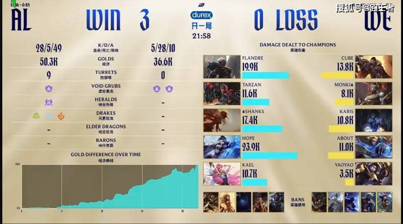 结果第三局比赛,WE感觉实力差距太大,22分钟就放弃了比赛。3分钟,Cube杰斯对线打出压制,但是急于单杀反被Flandre拿下一血;4分钟,急转直下,Cube杰斯刚回线上再次遭到Flandre狼母单杀;10分钟,依旧全线开花,Shanks岩雀压制力拉满轻松完成单杀;12分钟,下路对拼完全碾压,AL乘胜追击打出0换3;14分钟,Karis闪现反向大招效果不佳,AL团战继续碾压完成0换4;18分钟,Hope寒冰一箭命中Cube,AL众人18分钟险些一波拆掉基地;最终21分58秒,AL团灭WE,赢下比赛。