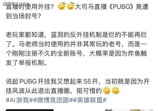 大家好,S16赛季的比赛已经正式开始了,相信绝大多数的玩家都关注了最近一段时间的对抗。Lpl赛区的季后赛即将进行,这段时间的休赛期大家还是非常无聊的。前英雄联盟一哥大司马的回归引来了全网玩家的热议,结果在最近的直播中他出现了了很严重的问题,本来正在进行正常的绝地求生对抗,结果被蓝洞官方当场封号了,原因也是非常的明确就是怀疑使用了外G。一下子就引来了全网玩家的热议,很多人纷纷表示他的这波操作让大家想起了当年的那个男人,White五五开。