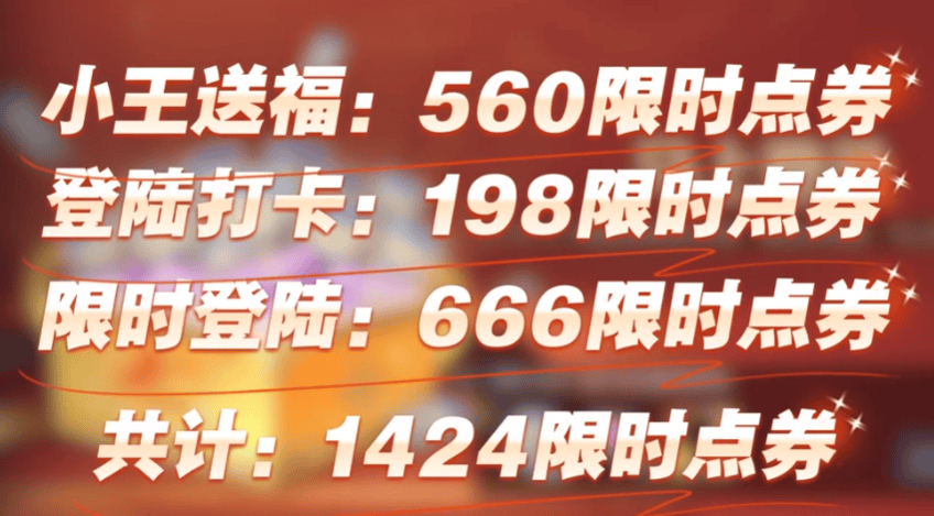 其实之前就有玩家统计过了,如果你很懒的,只想纯白嫖限时点券,其实是凑不齐1688的,除非你是欧皇,小王送福每次都能够猜中不少,但是其实大多数玩家能够拿个六等奖都不错了,所以基本上都是保底的限时点券,每天都要登录一下。但是过年期间,不少玩家其实时间很少,都是拿保底的,但是最后你会发现,怎么就只差几十就到1688了呢?