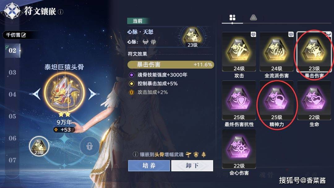 千仞雪:优先24星渡鸦,毕业4渡鸦+2狼人;1号位(暴伤/会伤)、6号位(攻击/会心/暴击)