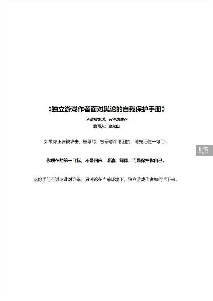 鬼鬼说,这则手册的诞生是因为“真的经常遇到制作人被舆论困扰”。它的内容并不复杂,共有11个章节,涵盖了从“面对(舆论)攻击时行为上应该怎么做” 到“如何处理自己的心态和情绪” 等方面。很快,它得到了不少游戏开发者、乃至内容创作者们的关注和响应,不少人认为“以现在的互联网环境,非常有用”。