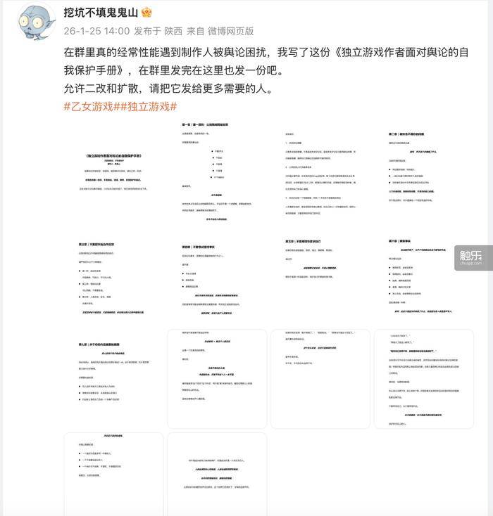 1月25日,独立游戏开发者鬼鬼在自己的微博账号发布了一篇《独立游戏作者面对舆论的自我保护手册》。
